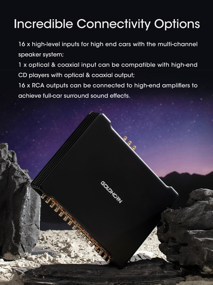The Goldhorn DSP16 Ultra is a 16-channel digital signal processor designed for complex, fully active car audio systems. It is intended for advanced system builders requiring high channel counts, high-resolution processing, and precise control over every stage of signal management.